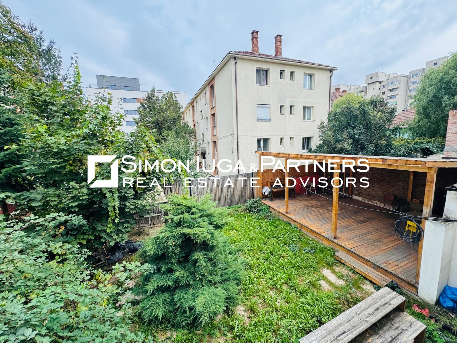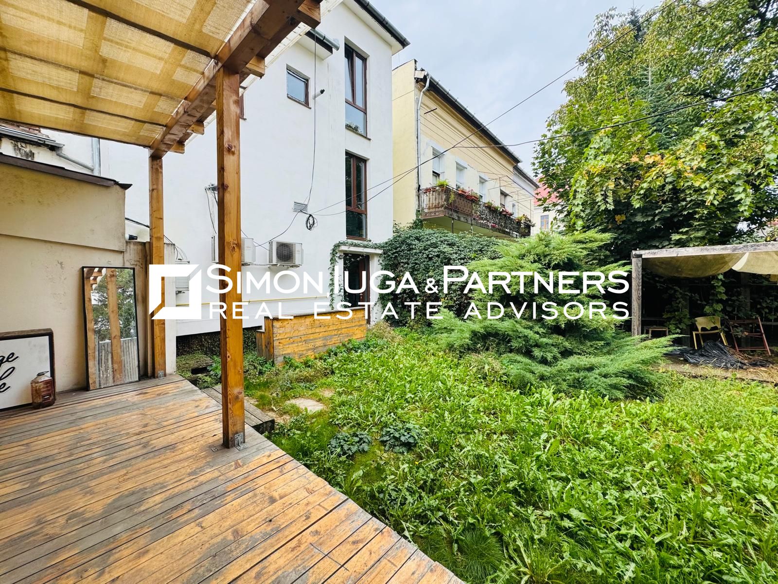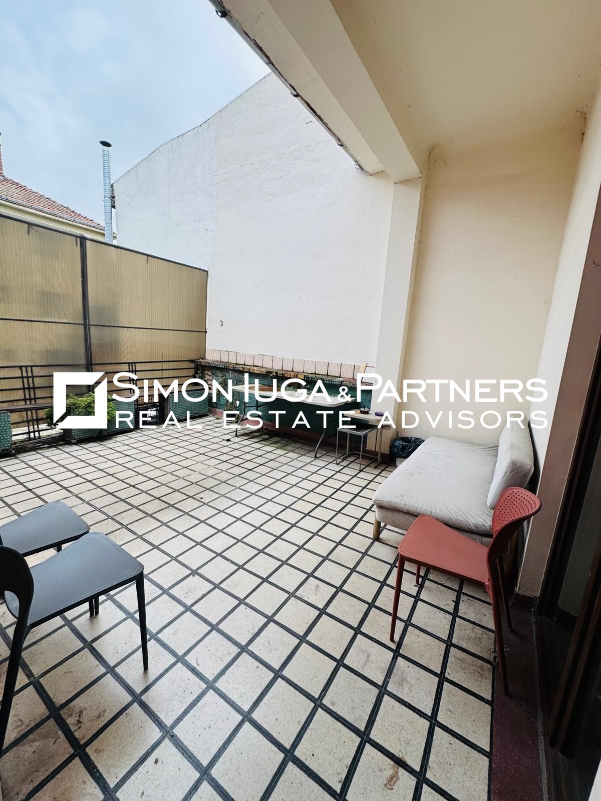 -o terasă mare, două balcoane și acces la grădina din spatele clădirii.